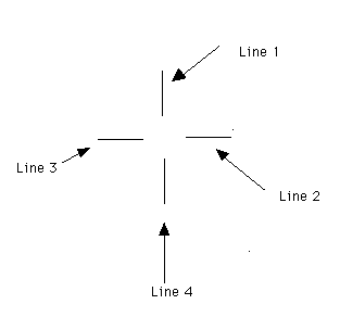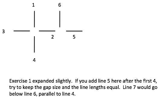 Take a blank piece of paper and draw a vertical line. Look at the line on the page. Then draw a horizontal line below and to the right of the vertical line. For your third line, draw another horizontal line to the left of the vertical line and below it so that the two horizontal lines are exactly opposite one another with a gap between them. The vertical line should be centered between them. Finally, add a vertical line below the horizontal lines, opposite the first vertical line, with a gap the same size as the gap between the two horizontal line segments. A version of these four lines would look about like this (making the lines equal length):